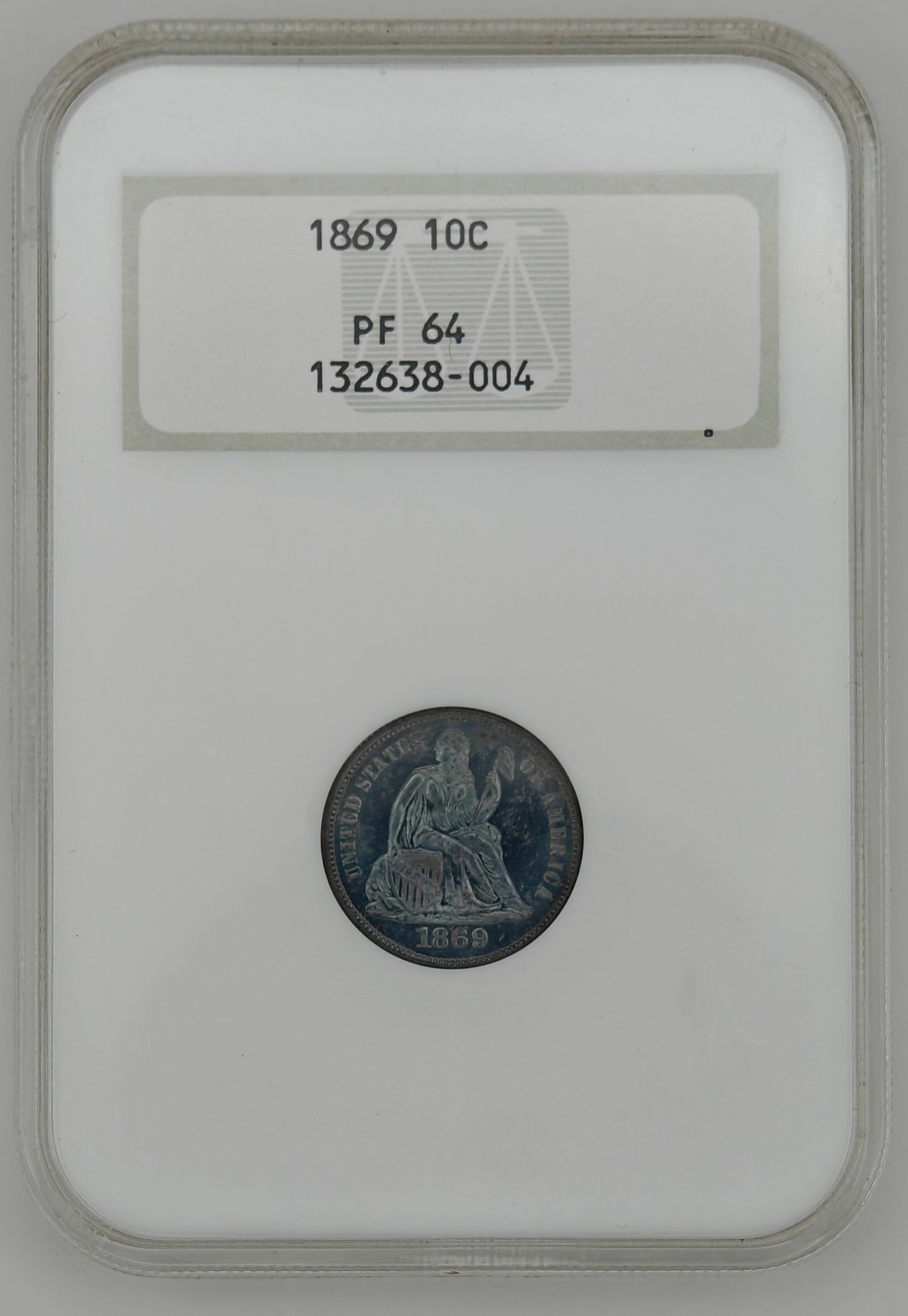 This 1869 Liberty Seated Dime, graded PF-64 by NGC, is a remarkable proof coin that captures the classic design and craftsmanship of the era. Its high grade ensures strong eye appeal and sharp details, making it a valuable addition for collectors seeking quality proof coins from this historic period.