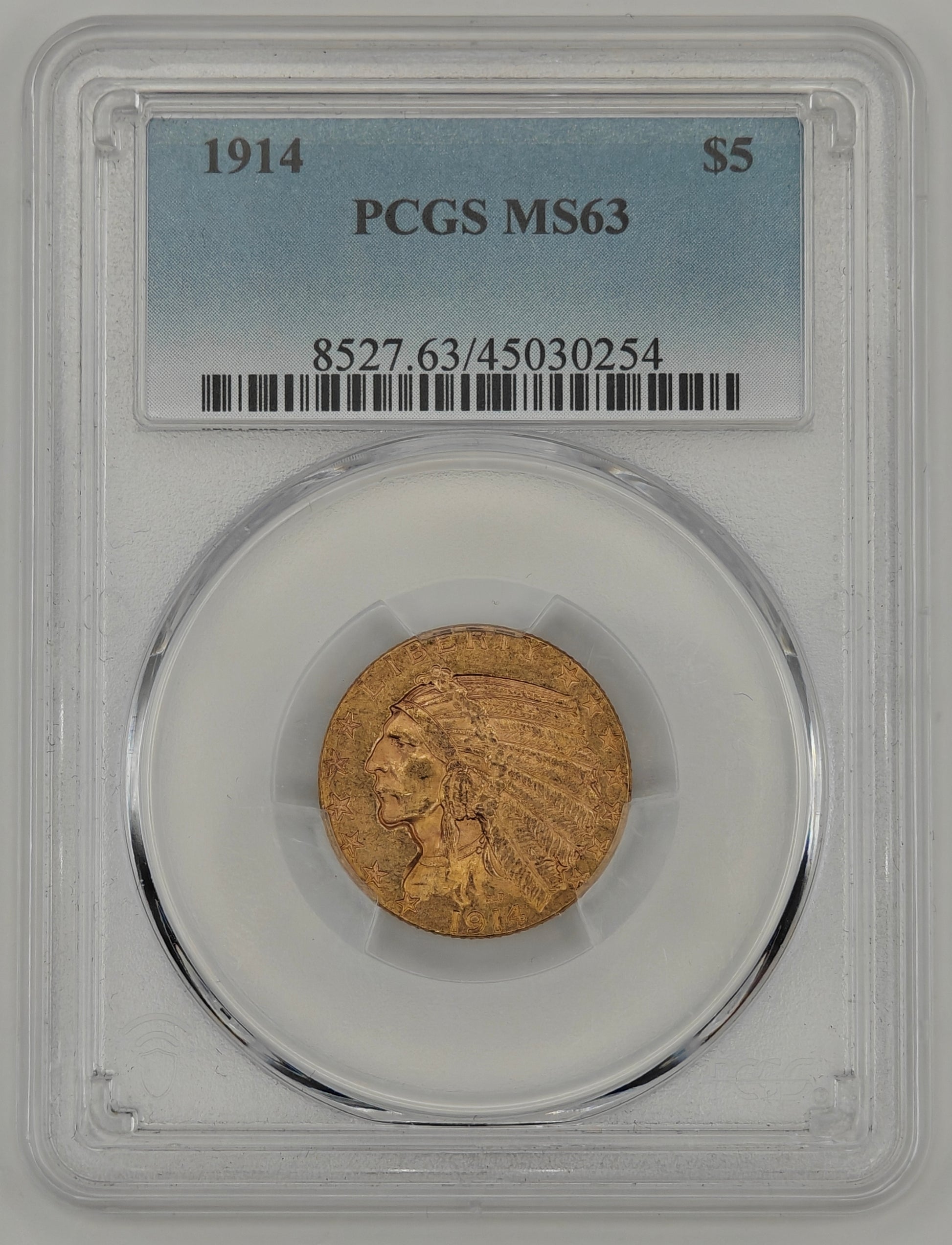 This 1914 $5 Gold Indian Half Eagle, graded MS-63 by PCGS, is a beautifully preserved example of classic American coinage. Its high-grade condition ensures strong eye appeal with minimal marks, making it a meaningful addition for collectors who value both historical significance and quality in their precious metals investments.