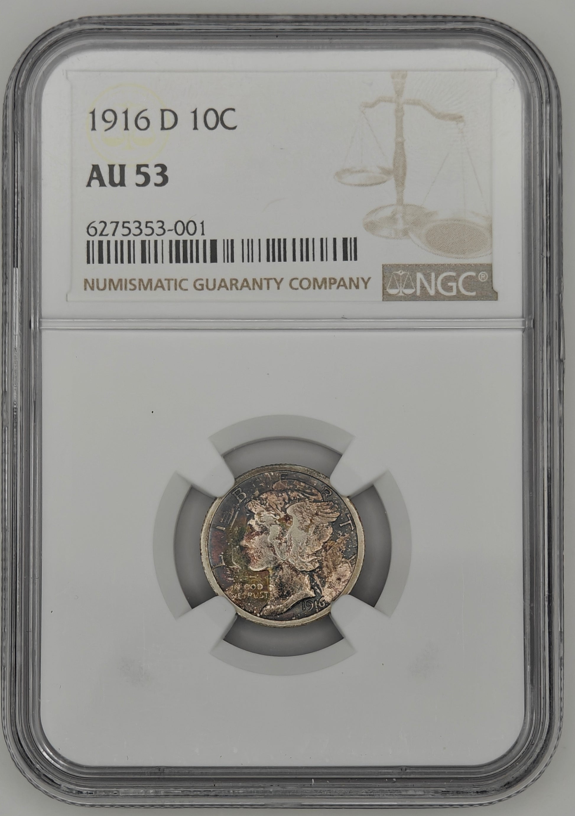 This 1916-D Mercury Dime, graded AU-53 by NGC, offers collectors a well-preserved example of this iconic coin. Struck at the Denver Mint, its high grade reflects light wear while maintaining sharp design details. It’s a valuable piece for those looking to enhance their collection with a classic and historically significant dime. Nice original color.